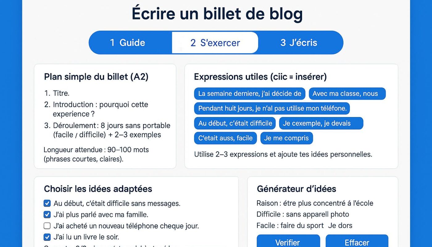 Expression écrite guidée : 8 jours sans téléphone portable (niveau A2, guide pour anglophones)