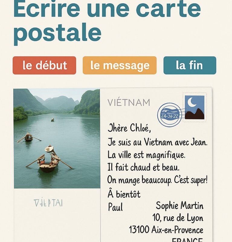 Écrire une carte postale (niveau A1, aide pour anglophones). Guide + exercices